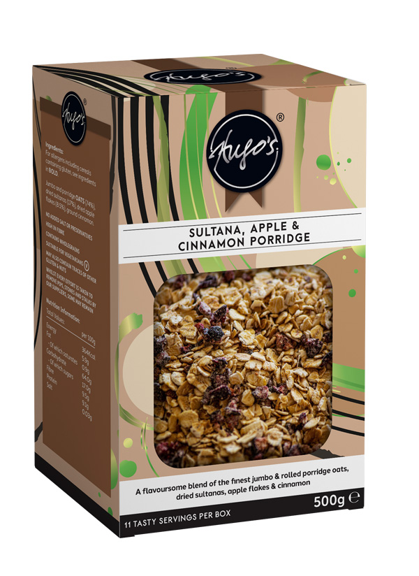 |   | Hugo's Sultana, Apple & Cinnamon Porridge £5.20£5.20 per 500g box plus P&PNew Edition Porridge October 2025 See About Hugo's Breakfast for details |
